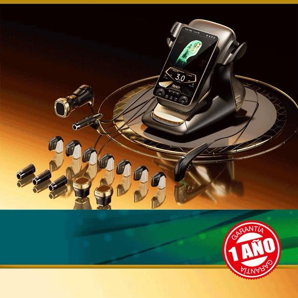 Además, incluye 9 transductores de distintas profundidades, lo que permite una personalización precisa del tratamiento, tanto facial como corporal, ajustándose a las capas anatómicas de cada persona.